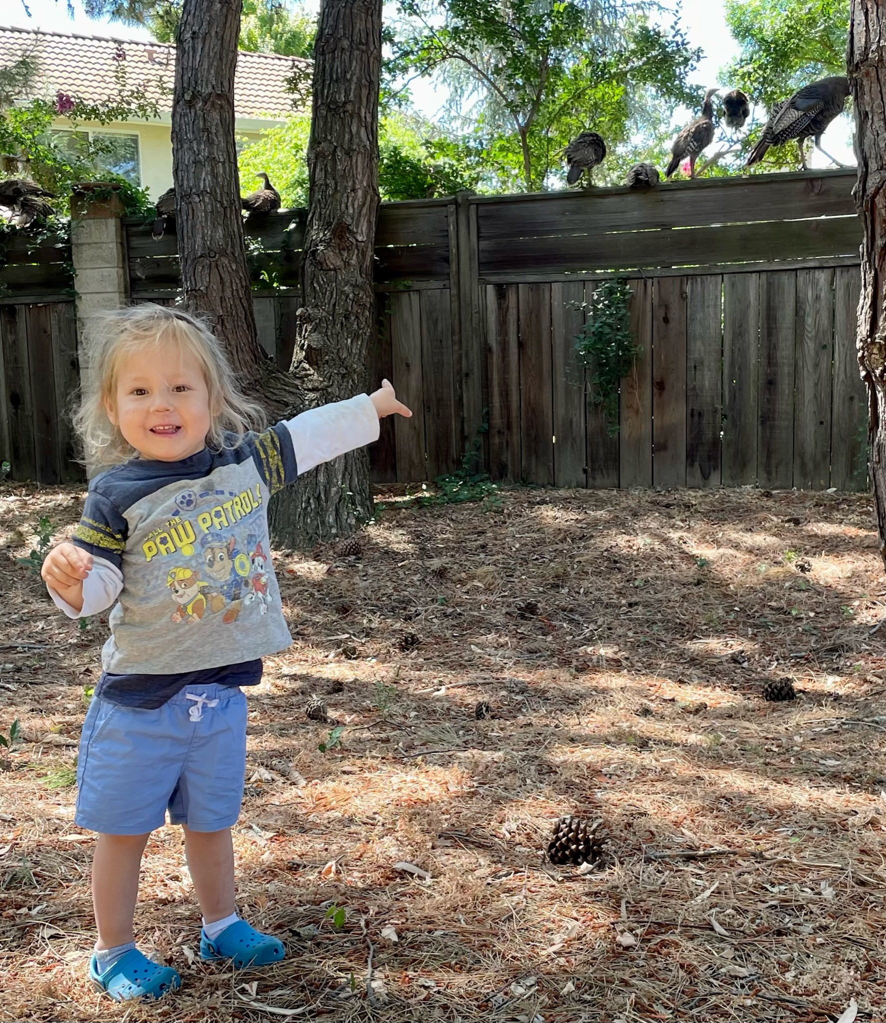 Arthur spots a flock (gaggle or rafter) of young turkeys on the way back to Grandpa's from playing at Mace Ranch Park. They flew up to a fence when they saw us coming. They were in Grandpa's yard yesterday. July 2023