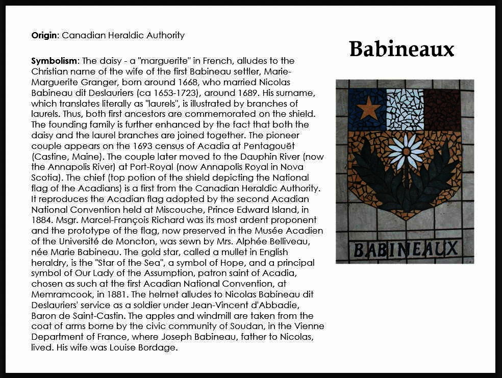 Antoine Joseph Babineau and his son Nicholas came from Soudan, France to Southern to Pentagoet in Acadia (Nouvelle France), which is near what is now Fort George Maine between 1665 & 1685 (Sources disagree. See below).