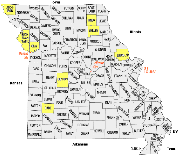 Sikes - Novelty, Knox Co. and Shelby Co. The founder of the village of Novelty was Nars W. Hunter, who, in June, 1857, laid out the little town on Section 11, Township 60, Range 12. The land was entered by Clary Pulson, in October, 1836. The place was long a well known trading point and was raided during the Civil War...In 1887 it was a considerable village, with a good trade, and intelligent and enterprising class of citizens, an excellent school, lodges and churches, etc Thomas - Parkville, Platte Co., Clay Co. Gard / Webb - At Gard Meddaugh's site he says: Somewhere in the early 1840s, the Gard family moved to Missouri. I have heard both to Atchison Co. Missouri and to Atchison Twp. Buchanan Co. Missouri; the latter might be believable from the trip of Charles and John except that the only Missouri Atchison Twp. I can locate is in nearby Nodaway Co. Atchison County before February 1845 was "Platte Country" so we might assume that the family lived there after the name was established. One more snapshot is from:Benton County is somewhat west of the center of Missouri; the Webb family lived in Benton County for some time after that.Ê Another clue is that a distant cousin, Harrison Gard, was living in neighboring Morgan County, next to Benton County on the east, at the time. In March 1848, two weddings took place involving the daughters of Samuel Hand and Violet Wilson Jones [Violet was the little sister of my gg,g'ma, Annie Jones Webb]. I have seen various dates in early March for the weddings but don't believe it was a double wedding. On 4 March 1848 Sarah Annetta Hand m. Charles Anthony Piner; on 8 March, Eliza Jane Hand m. George Washington Gard both in Dade County, Missouri. Dade County is almost 100mi. South of Benton County and is where the Piner family moved from Callaway County, Mo.. The rest of this document will concentrate on Charles with notes on Jeremiah and Mahala. Finley - Lincoln Co. | |