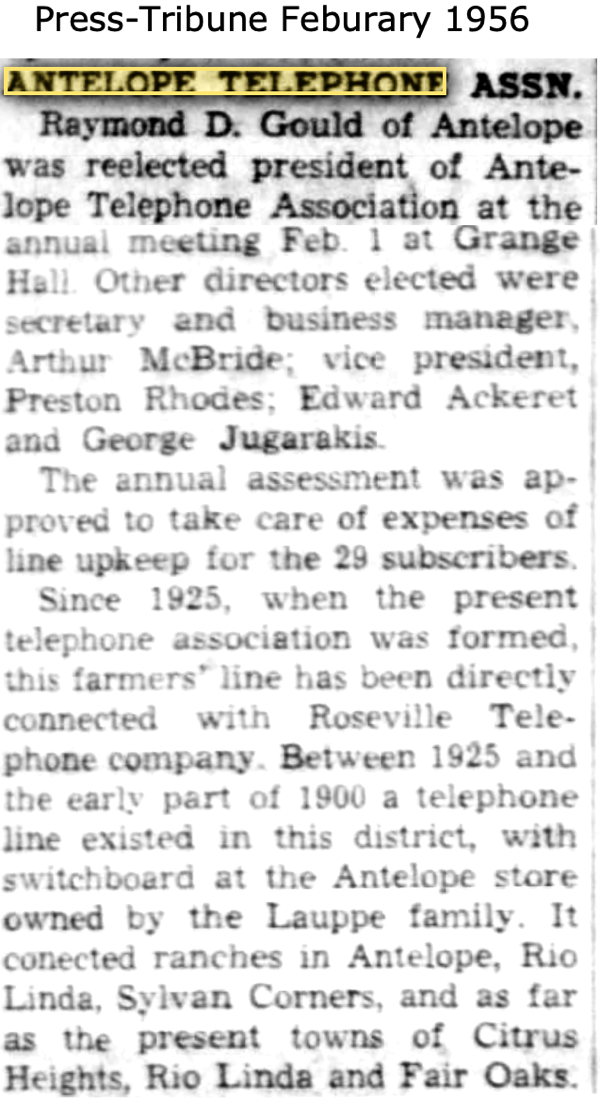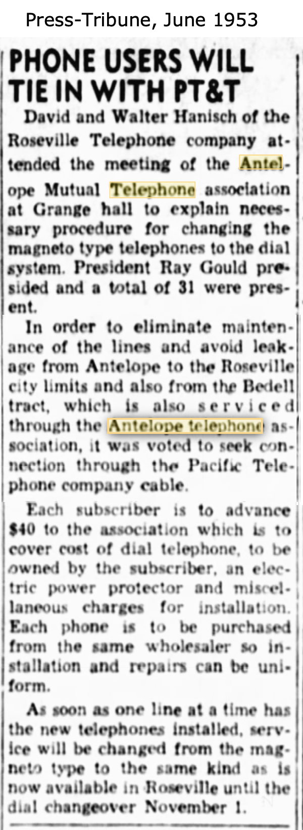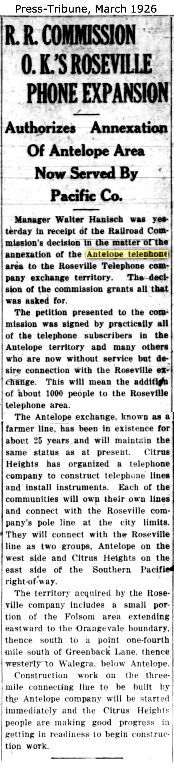 1926 - Transfered from Pacific Telephone to Roseville Telephone