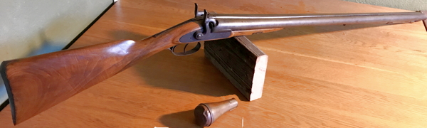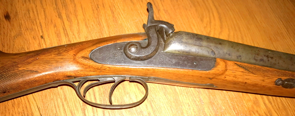 Muzzle loader percussion SxS double barreled 12 ga shotgun with 34 inch barrel. Made circa the 1850s in England.