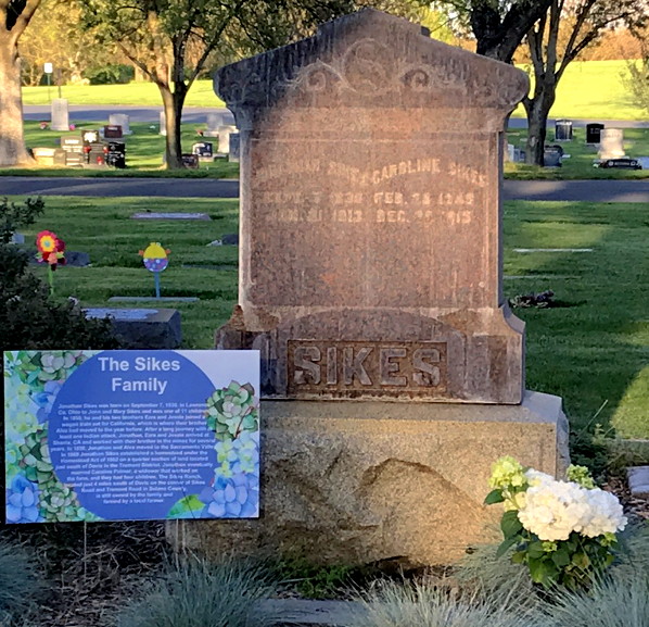 Jonathan Sikes was born on September 7, 1830 in Lawrence Co. Ohio to John and Mary Sikes and was one of 11 children. In 1850, he and his two brothers Ezra and Jessie joined a wagon train set for California, which is where their brother Alva had moved to the year before. After a long journey with at least one Indian attack, Jonathan, Ezra and Jessie arrived at Shasta, CA and worked with their brother in the mines for several years. In 1856, Jonathon and Alva moved to the Sacramento Valley. In 1869 Jonathan Sikes established a homestead under the Homestead Act of 1862 on a quarter section of land located just south of Davis in the Tremont District. Jonathan eventually married Caroline Palmer, a widow that worked on the farm, and they had four children: Clara, Alice, George 'Alvin' and Elsie. Alvin continued to farm on the ranch, and later married Clara Edna Thomas. 15 of the descendants of Alvin and Clara and their spouses have degrees from UC Davis, including 4 PhDs, 2 MSs, 9 BSs, and 2 Ag Certificates. William Davis, Alvin and Clara’s son-in-law, was a turf specialist and his grandson, Ben Davis, was a researcher who also worked for UC Davis. The Sikes Ranch, located just 4 miles south of Davis on the corner of Sikes Road and Tremont Road in Solano County, is still owned by the family and farmed by a local farmer.