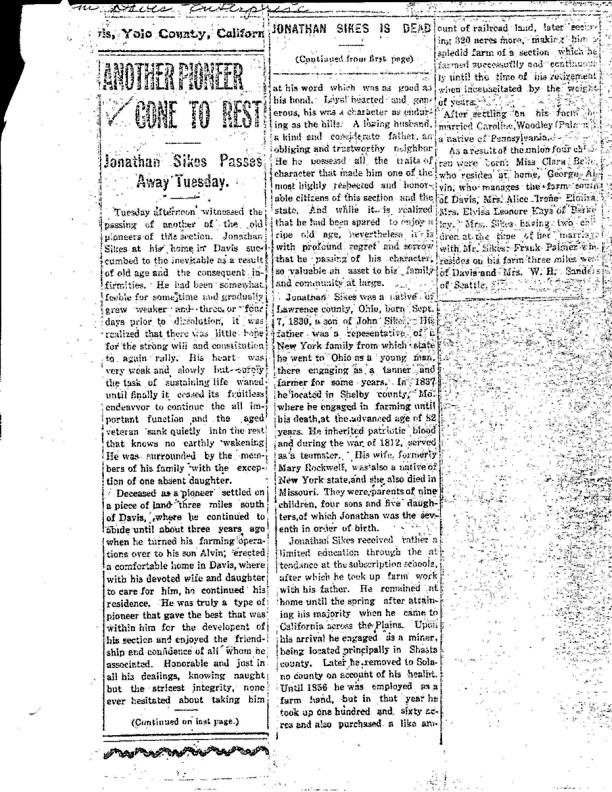 In 1856 Jonathan and Alva moved to the Sacramento Valley and began working on farms. Alva eventually bought his own land. In 1874 Caroline, her husband, Newton Palmer and two children (*) took the train and headed for California. In those days the train trip took 10 days. Mr. Palmer got ill with TB during the trip and wired his brother in Middletown, Calif. asking for help. His brother, who had met Jonathan on the journey across the plains, wrote a letter to Jonathan, asking him to meet the train in Davis and put his brother and his family up until he could come and get them. Jonathan met the train, but Mr. Palmer died a short time later. Jonathan never heard from the brother in Middletown, so he offered Mrs. Palmer, Caroline, a job on the ranch since she had two young children to support and nowhere to go. Caroline was concerned about taking this job; that this might be looked on as improper by the neighbors. Several of these neighbors advised her to take the job since she had no other way to support her children. They said as long as she conducted herself as a lady there would be no talk of her acting in an improper manner, so she accepted the job. Jonathan and Caroline were married on April 1, 1875. They had four children, Clara, Alice, George Alvin and Elsie. They had an appreciation for music; Clara became a piano teacher and Alvin played the violin. Their son, Alvin continued to farm the ranch when Jonathan retired and moved to Davis in 1910. Jonathan passed away there on Jan. 23, 1913, and Caroline died in 1915.