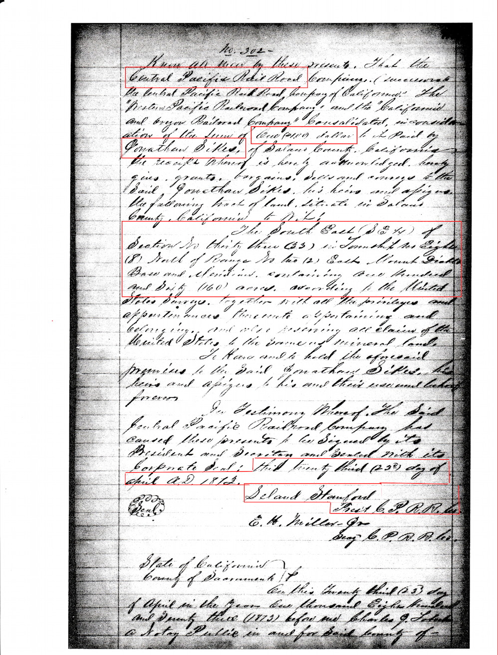 On April 23 rd 1873 Jonathan purchased the SE quarter section of Section 33 Township 8N Range 2E section from the Central Pacific Railroad for $100.